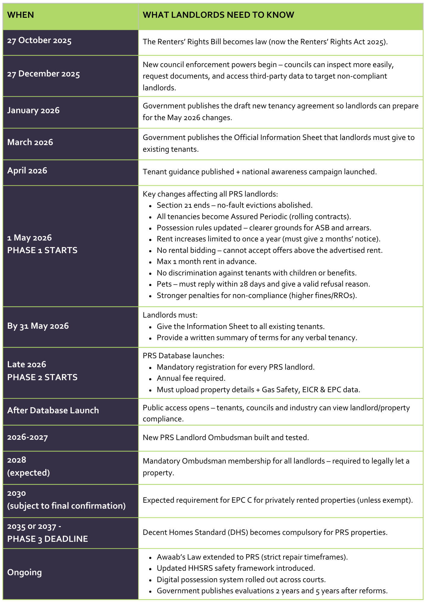 20. What does the Renters’ Rights Act roadmap look like, and when do the key changes take effect for landlords?